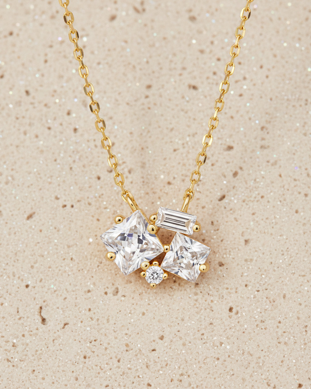 Presenting the Brilliant Pendant Necklace in radiant 14k or 10k solid gold—a dazzling centerpiece that catches the eye from every angle.Features a pendant crafted from four Moissanite stones of different sizes and shapes, arranged to maximize sparkle and create a dynamic, multi-faceted glow.The quartet of Moissanites creates a lively, contemporary brilliance that suits both everyday elegance and special occasions.Elevate your jewelry collection with this Brilliant Pendant Necklace—choose 14k or 10k to fit your style, and enjoy a radiant, multi-faceted centerpiece.
