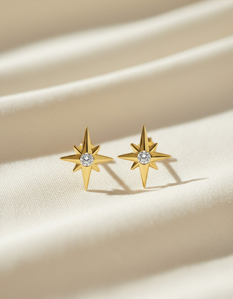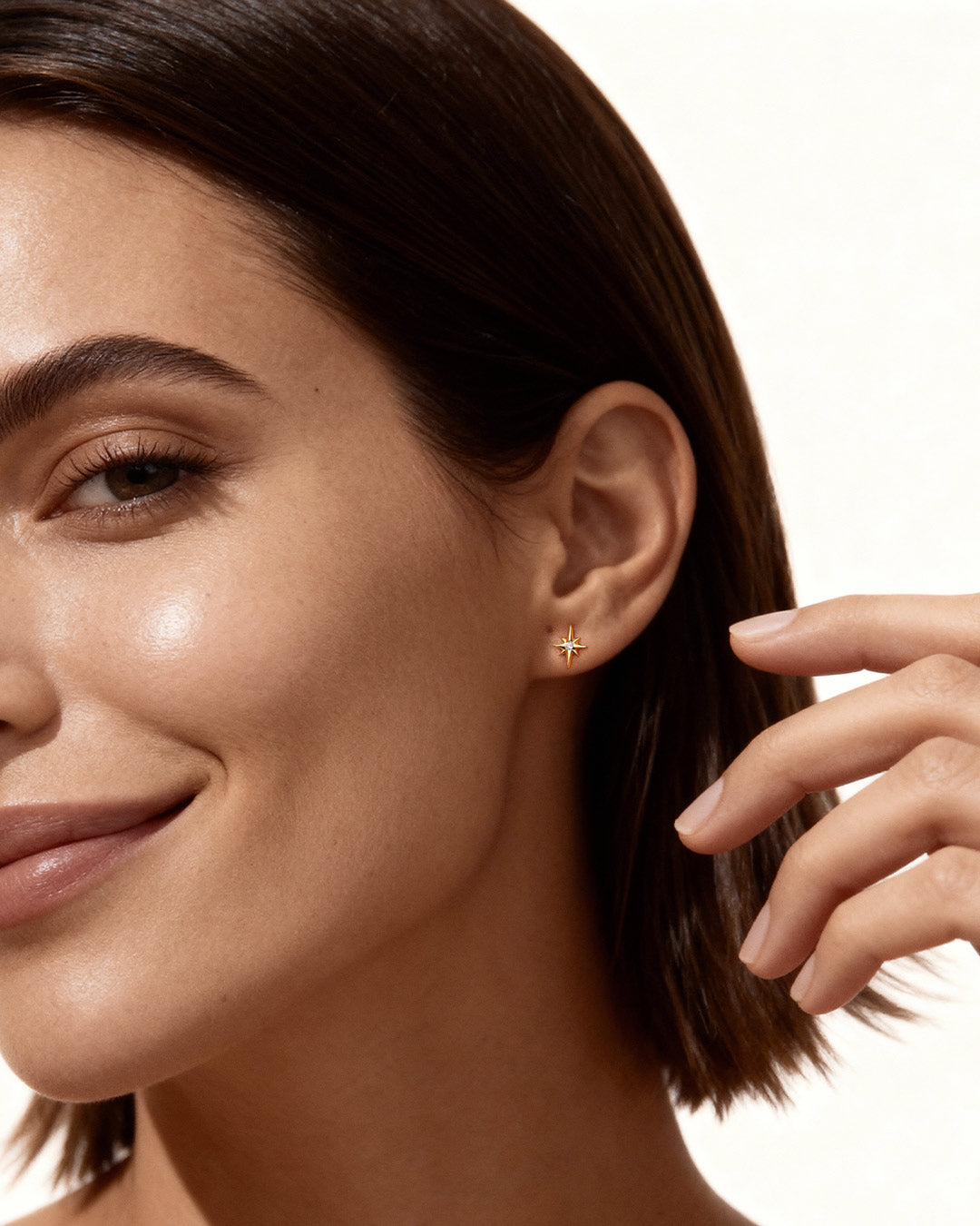 Illuminate your everyday with our Eight-Pointed Star Stud Earrings, crafted in solid 14k or 10k gold. Each stud showcases a precise, eight-pointed star motif that blends celestial symbolism with modern minimalism. The compact, low-profile design sits softly on the earlobe, offering subtle yet unforgettable sparkle. Built in solid gold for enduring shine and a hypoallergenic, comfortable wear, these earrings are a timeless addition to any jewelry wardrobe.