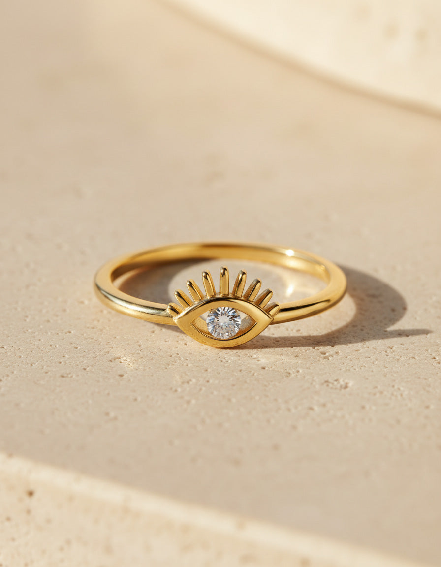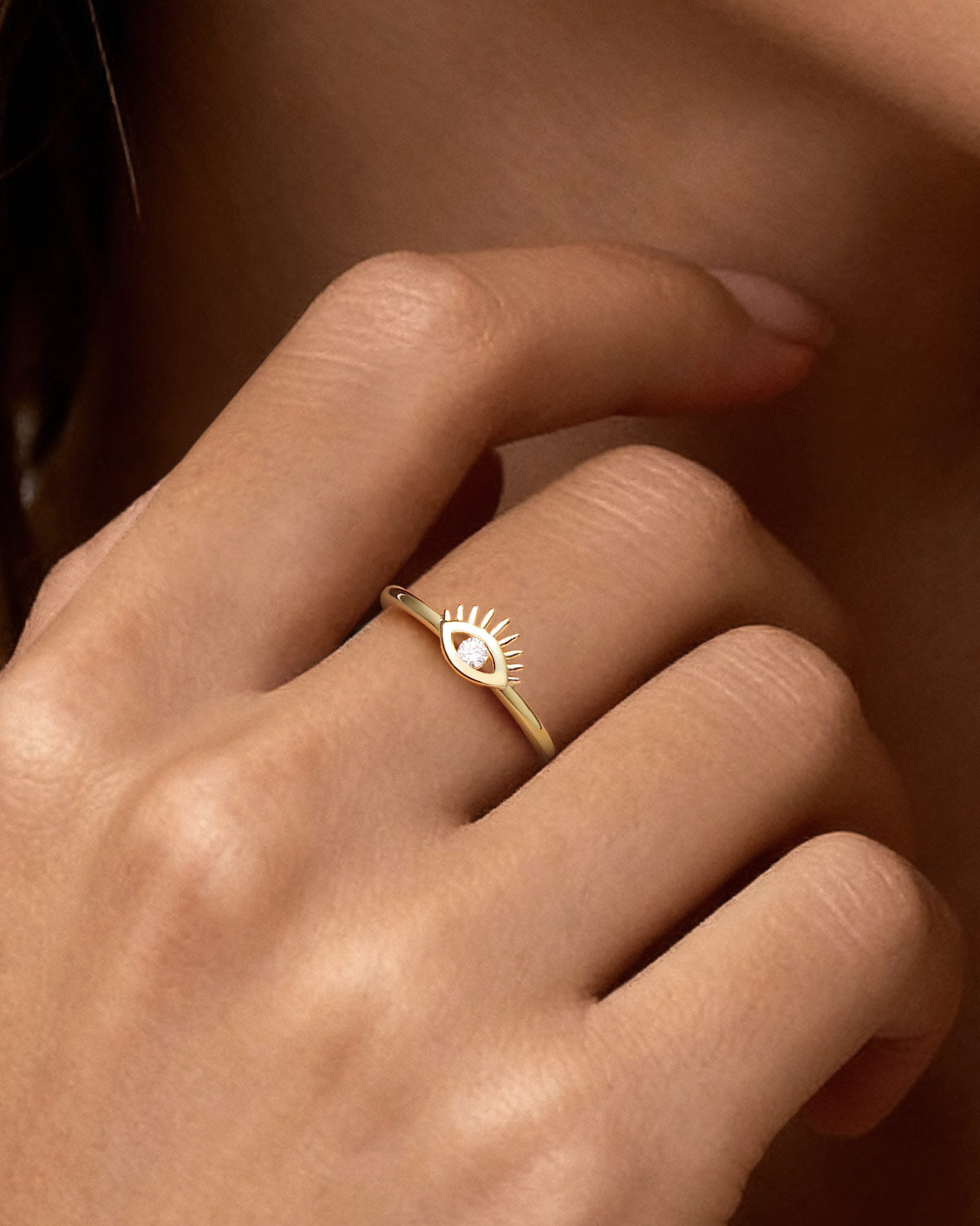 Introduce the Eye Diamonds Ring in radiant 14k or 10k solid gold—a bold, contemporary ring that makes a striking first impression.Features a distinctive eye motif with a single Moissanite bead set as the “iris,” creating a clean, modern focal point.The minimalist eye design offers a unique blend of elegance and edgy sophistication, suitable for stacking or wearing solo.Elevate your jewelry collection with this Eye Diamonds Ring—choose 14k or 10k to fit your style, and enjoy a contemporary centerpiece with timeless appeal.