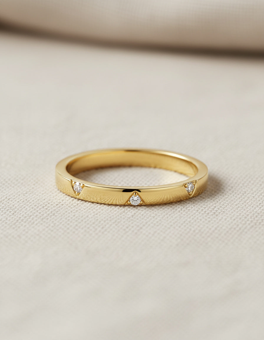 Catch the light from every angle with the Shiny Triangle 14k/10k Solid Gold Ring. This contemporary design features eight evenly distributed triangle motifs around the band, each triangle pavéd with a brilliant moissanite gemstone for a dazzling, fire-filled sparkle. Crafted in a durable blend of 14k and 10k solid gold, the ring offers both radiant beauty and lasting everyday wear.